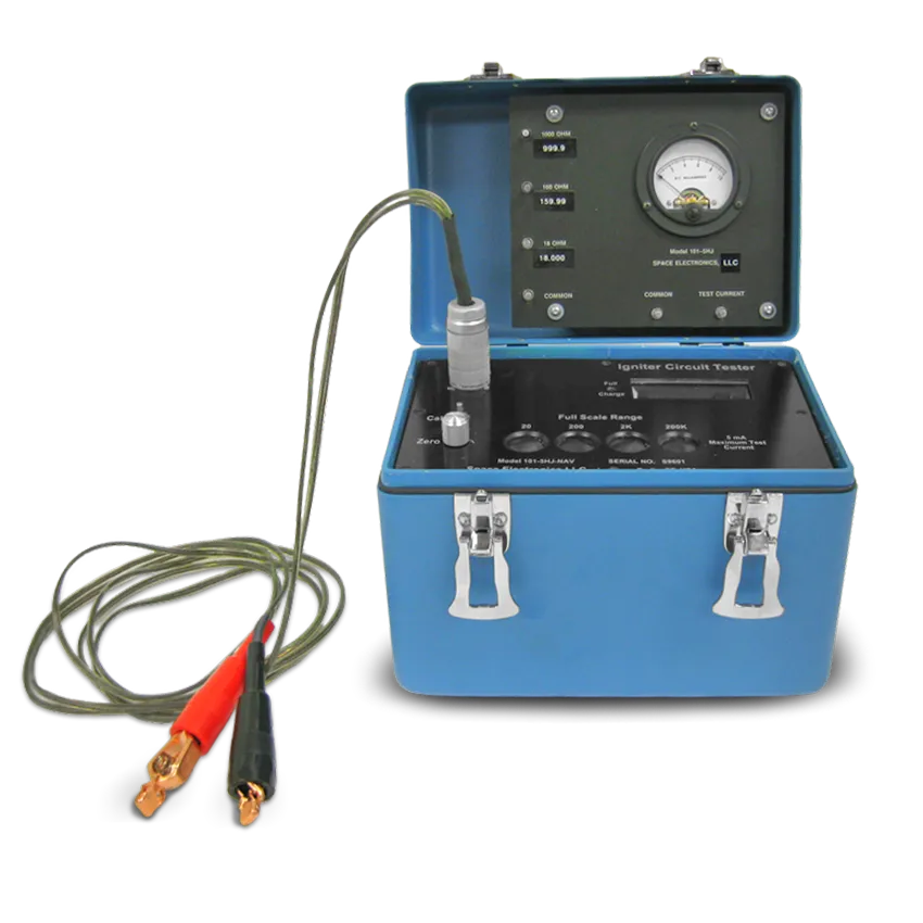 Testers for testing explosive circuits in the field. Designed for testing explosive circuits such as missile fuzes, airbag squibs, or other electrically detonated ordnance in the field. Space Electronics portable igniter circuit testers can test diodes and measure resistances with great accuracy while dramatically reducing the risks of accidental detonations because of their built-in fail-safe modules.